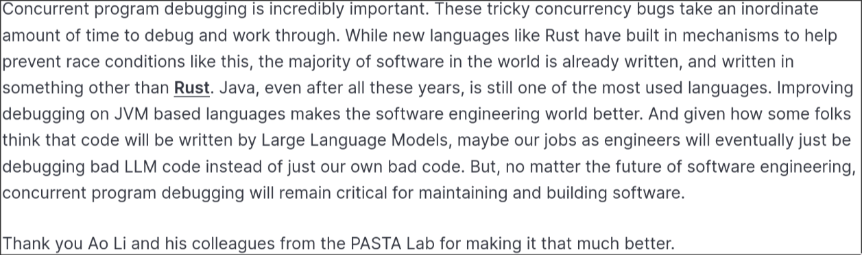 I design and build tools that make complex concurrent and distributed systems easier to debug and test. My research treats applicability as a first-class concern—emphasizing not just algorithmic efficiency, but also usability and real-world practicality. I've developed tools such as: ExChain (NSDI '24), which analyzes complex exception interactions to dramatically reduce debugging effort; Fray (OOPSLA 25'), a controlled concurrency testing platform that helps developers catch bugs in complex concurrent systems; and Fest (NSDI 26'), a feedback-guided testing algorithm that catches design bugs early in distributed system development.